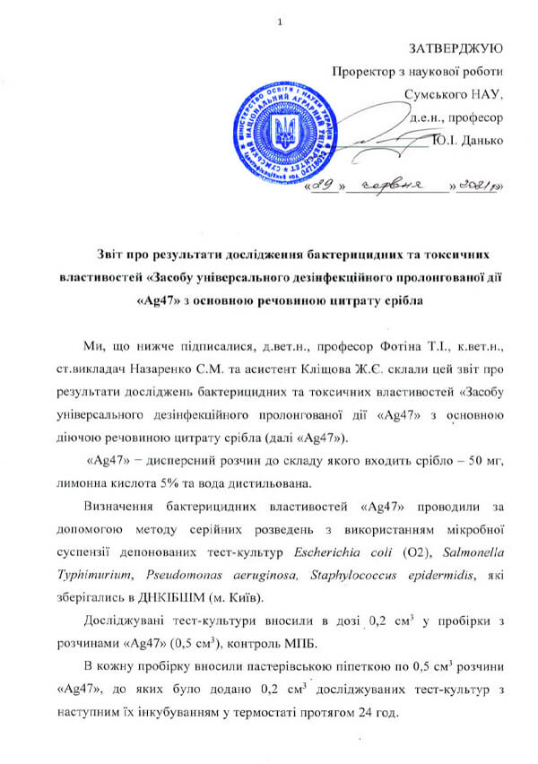 Ефективний проти грамнегативних і грампозитивних патогенних мікроорганізмів - Salmonella enteritidis, мікобактерій туберкульозу Mycobacterium B5 (паличка Коха), золотистого стафілокока Staphylococcus aureus і стафілокока Еnterica, кишкової палички Escherichia coli, синьогнійної палички Pseudomonas aeruginosa та Pseudomonas звичайної,сальмонели Thyphimurium, диплоїдного грибка Candida albicans (молочниця), дерматофітії, вищих цвілевих грибів Aspergillus Niger, Aspergillus Flavus, спороутворюючих бактерій Bacillus cereus тощо; вірусів бактеріофаг T2 (ВІЛ/СНІД), гепатитів, поліомієліту, грипу, африканської лихоманки A. Suum, бруцельозу E.Suis і Т. Suis. Є ефективним засобом для знищення збудників паразитарних хвороб – езофагостомозу О. Dentatum, яєць та личинок гельмінтів, геогельмінтів, цист та ооцист кишкових найпростіших. Відзначається ефектом пролонгованої дії до 6 місяців залежно від концентрації робочого розчину, або до змивання.
