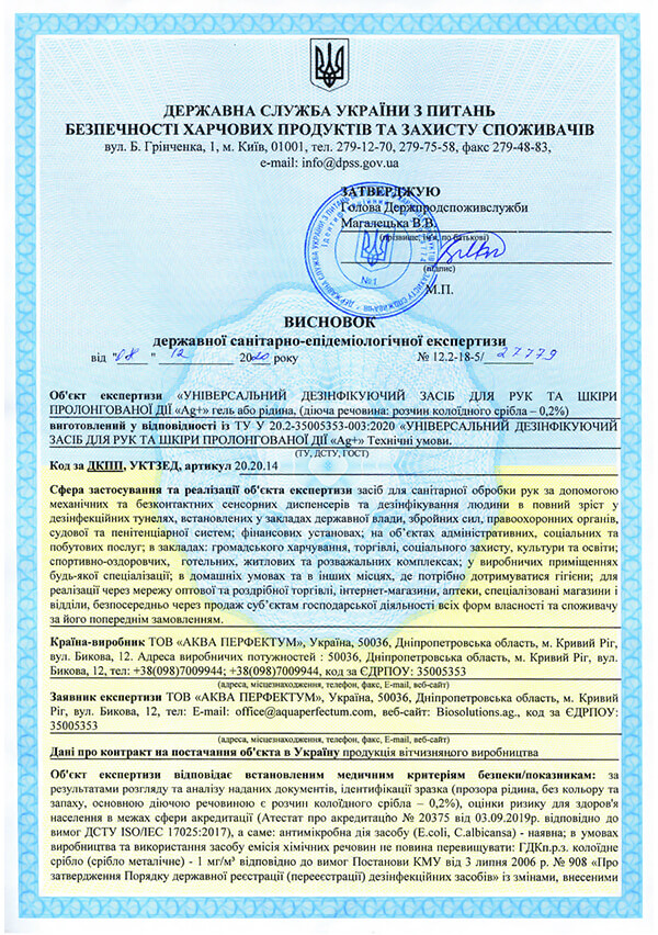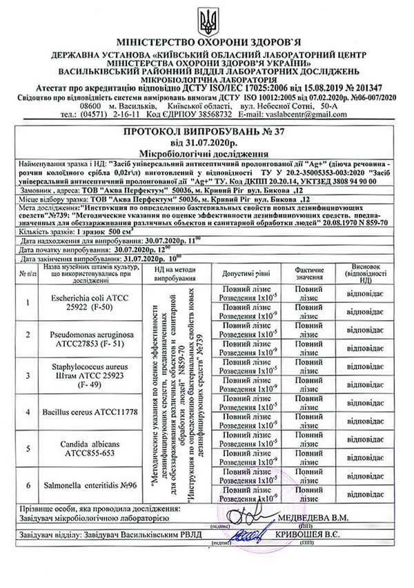 Eficaz contra los patógenos gramnegativos y grampositivos - Salmonella enteritidis, Mycobacterium tuberculosis Mycobacterium B5 (bacilo tuberculoso), Staphylococcus aureus y Staphylococcus Enterica, Escherichia coli, Salmonas aeruginosa y Pseudomonas aeruginosa, Pseudomonas (habituales), dermatofitos, hongos superiores Aspergillus Niger, Aspergillus Flavus, bacterias formadoras de esporas Bacillus cereus, etc.; virus bacteriófago T2 (VIH/SIDA), hepatitis, polio, influenza, fiebre africana A. Suum, brucelosis E. Suis y T. Suis. Es un medio eficaz para la destrucción de patógenos de enfermedades parasitarias: esofagostomosis O. Dentatum, huevos y larvas de helmintos, geohelmintos, quistes y ooquistes de protozoos intestinales.